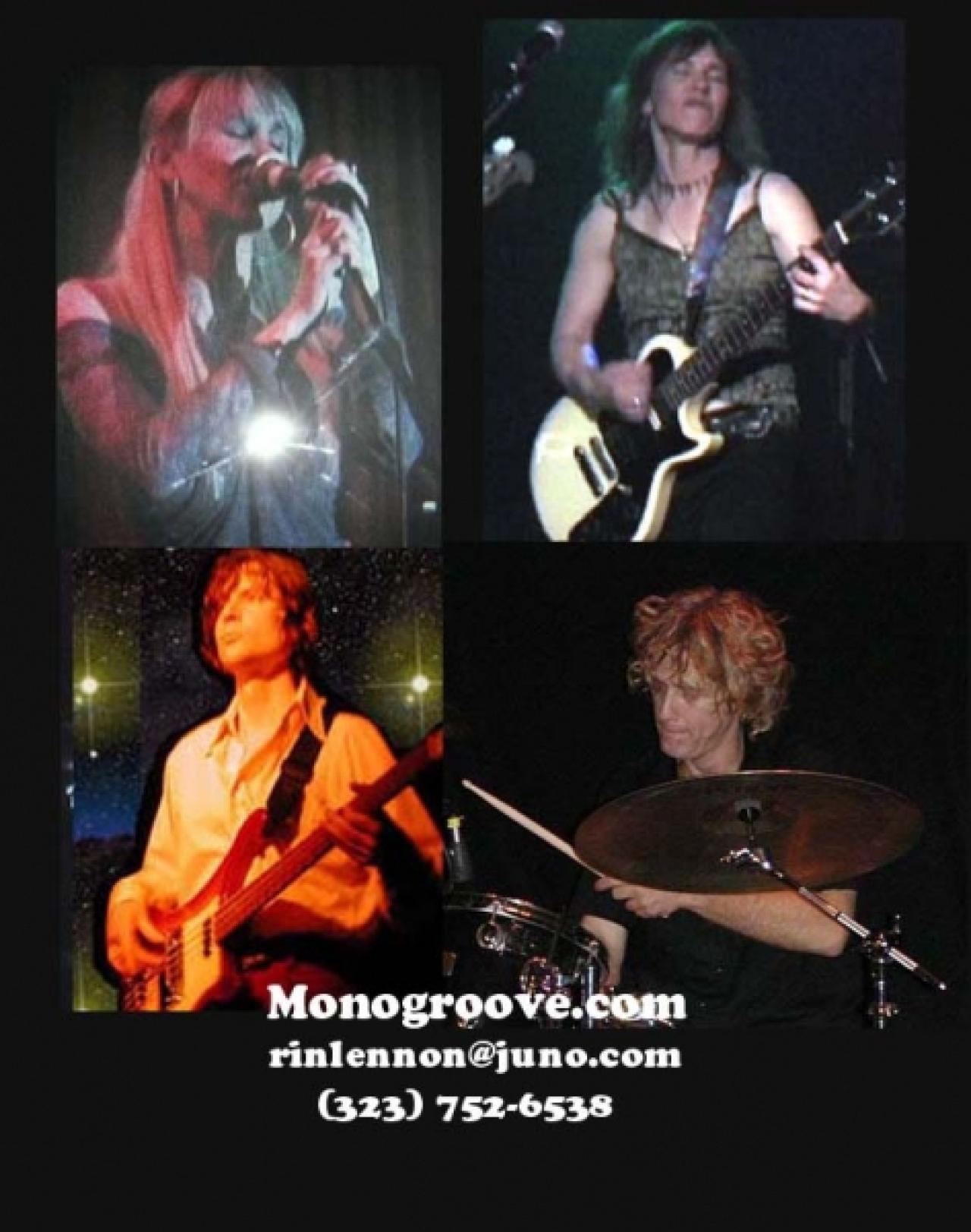"GREAT STUFF!" - Lee Joseph, Dionysus Records. Monogroove has been featured on the Local Licks radio program hosted by Terry Gladstone on station KLOS and been selected by Music Connection magazine as one of The Hot 100 Unsigned Artists. "Monogroove’s vocal arrangements stand out most. The singing on “Wonder Who She Is” even hints at shades of Mamas & The Papas"---Dan MacIntosh/Indie-Music.com "Monogroove captures a great sound with female vocals that sound comparable to Dusty Springfield ... " Jason Martinez, livemagazine.com " Monogroove creates hard-charging rock with truckloads of vocal harmony." "Serving as proof that a band can play aggressively and still retain sugary harmonies ... They’re capable of producing scorching numbers whose melodies never get lost in the shuffle. And, if one can get past the fact that these guys and gals don’t play too rigidly along categorical lines, then Monogroove has some serious chops to dig into." Albert Vega, Music Connection "Feel Good Band" Lennon was a tough no holds barred guitarist,who played as if her life depended on it, creating such heavy grooves you could hardly sit still" Bernard Baur, M.C. Magazine. "This group also make good use of dual lead vocals" Bob Leggett—M.C. Mag. Monogroove has been cited as having many influences, such as: the Beatles, the Kinks, Bob Dylan and the Byrds. You can definitely hear the infusion of these different styles when listening to their recent release, Real.--Brain Ball-Womens rock radio. "GREAT STUFF!" - Lee Joseph, Dionysus Records. Monogroove has been featured on the Local Licks radio program hosted by Terry Gladstone on station KLOS and been selected by Music Connection magazine as one of The Hot 100 Unsigned Artists. "Monogroove’s vocal arrangements stand out most. The singing on “Wonder Who She Is” even hints at shades of Mamas & The Papas"---Dan MacIntosh/Indie-Music.com "Monogroove captures a great sound with female vocals that sound comparable to Dusty Springfield ... " Jason Martinez, livemagazine.com " Monogroove creates hard-charging rock with truckloads of vocal harmony." "Serving as proof that a band can play aggressively and still retain sugary harmonies ... They’re capable of producing scorching numbers whose melodies never get lost in the shuffle. And, if one can get past the fact that these guys and gals don’t play too rigidly along categorical lines, then Monogroove has some serious chops to dig into." Albert Vega, Music Connection "Feel Good Band" Lennon was a tough no holds barred guitarist,who played as if her life depended on it, creating such heavy grooves you could hardly sit still" Bernard Baur, M.C. Magazine. "This group also make good use of dual lead vocals" Bob Leggett—M.C. Mag. Monogroove has been cited as having many influences, such as: the Beatles, the Kinks, Bob Dylan and the Byrds. You can definitely hear the infusion of these different styles when listening to their recent release, Real.--Brain Ball-Womens rock radio.